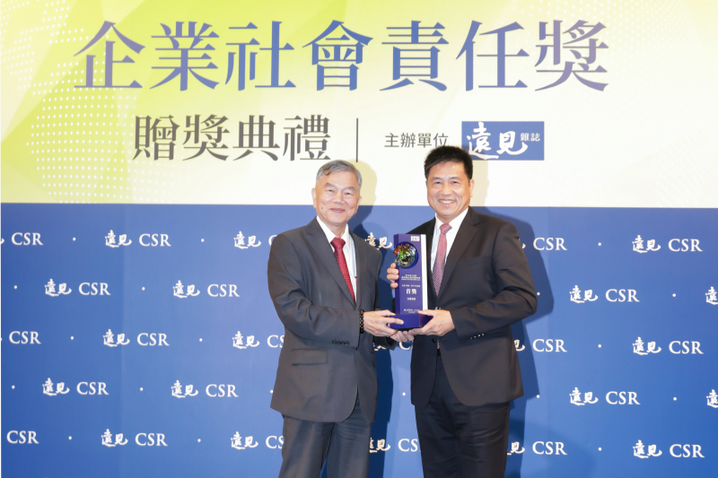 友達光電獲 2019 遠見 CSR 年度大調查「電子科技業組」首獎,由經濟部部長沈榮津頒獎 (左),友達光電董事長暨執行長彭雙浪受獎 (右)